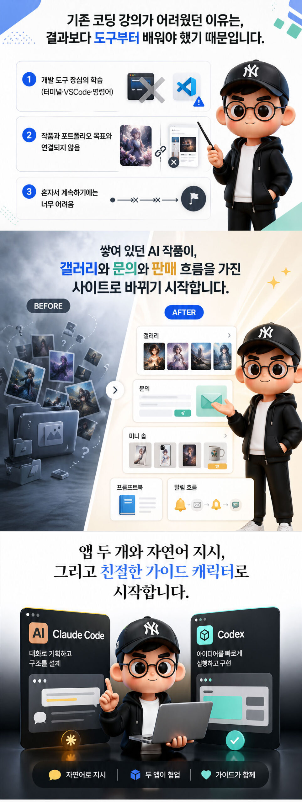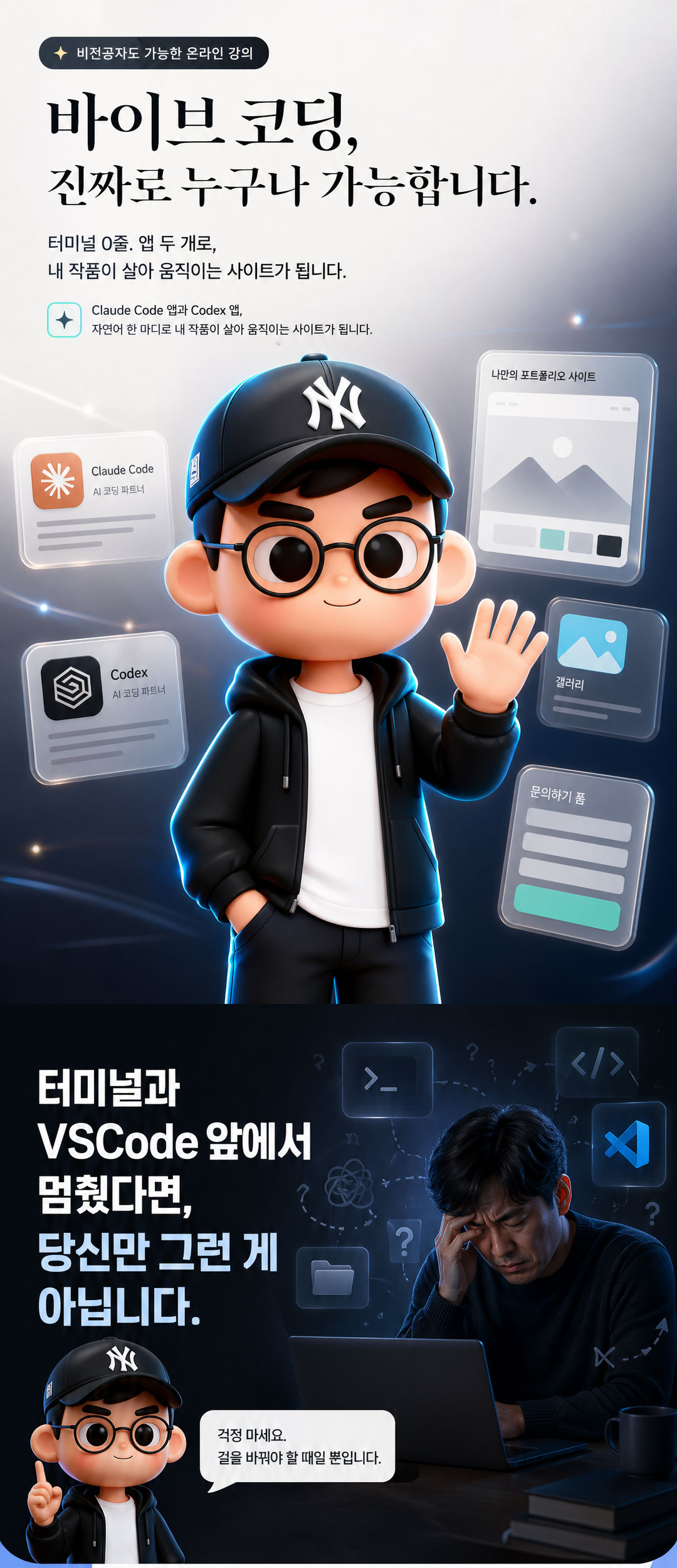 | 1회차 | 첫 앱 만들기 • Claude Code 앱 · Codex 앱 설치와 동작 원리 (Mac / Windows 모두) • 자연어 한 마디로 사이트 디자인부터 코드까지 자동 생성 체험 • 로고 · 프로필 이미지 AI 생성 워크플로 • GitHub 가입 → Vercel 무료 배포 → 본인 라이브 URL • 두 앱의 역할 분담과 요금제, 첫 한 달 가장 효율적인 구독 조합 |