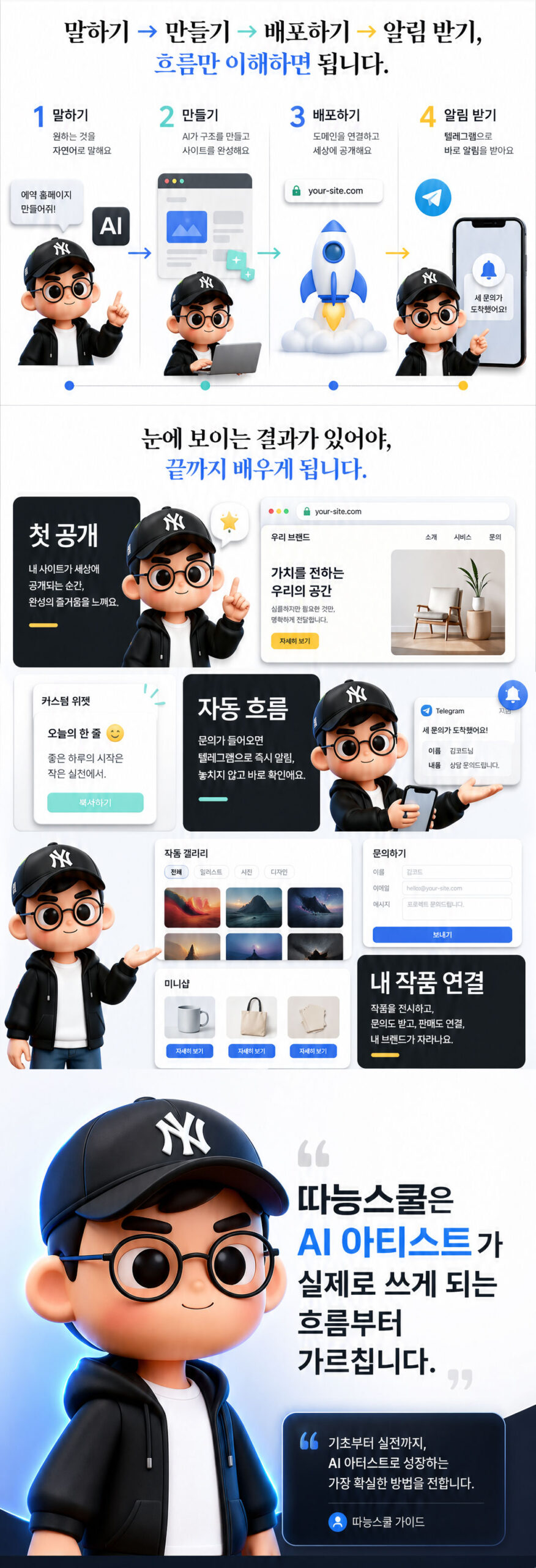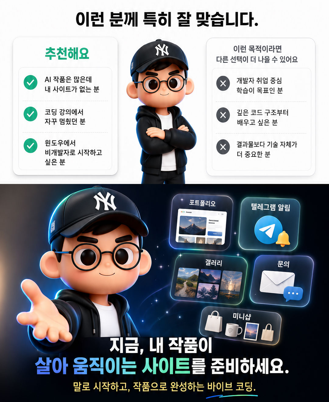 | 2회차 | 사이트가 AI를 품다 • (a) 전용 이미지 에디팅 앱을 프롬프팅만으로 구현 — 사진 업로드 → 프로필 자동 변환 등 • (b) 바이럴 프롬프트 발굴 노하우 — 트위터·레딧·아트 커뮤니티 검증 프롬프트를 본인 사이트에 심기 • 작품 설명 · 다국어 카피 자동 생성, 작품 변형 위젯 • 1회차 결과물 갤러리 라운드 + 피드백 |