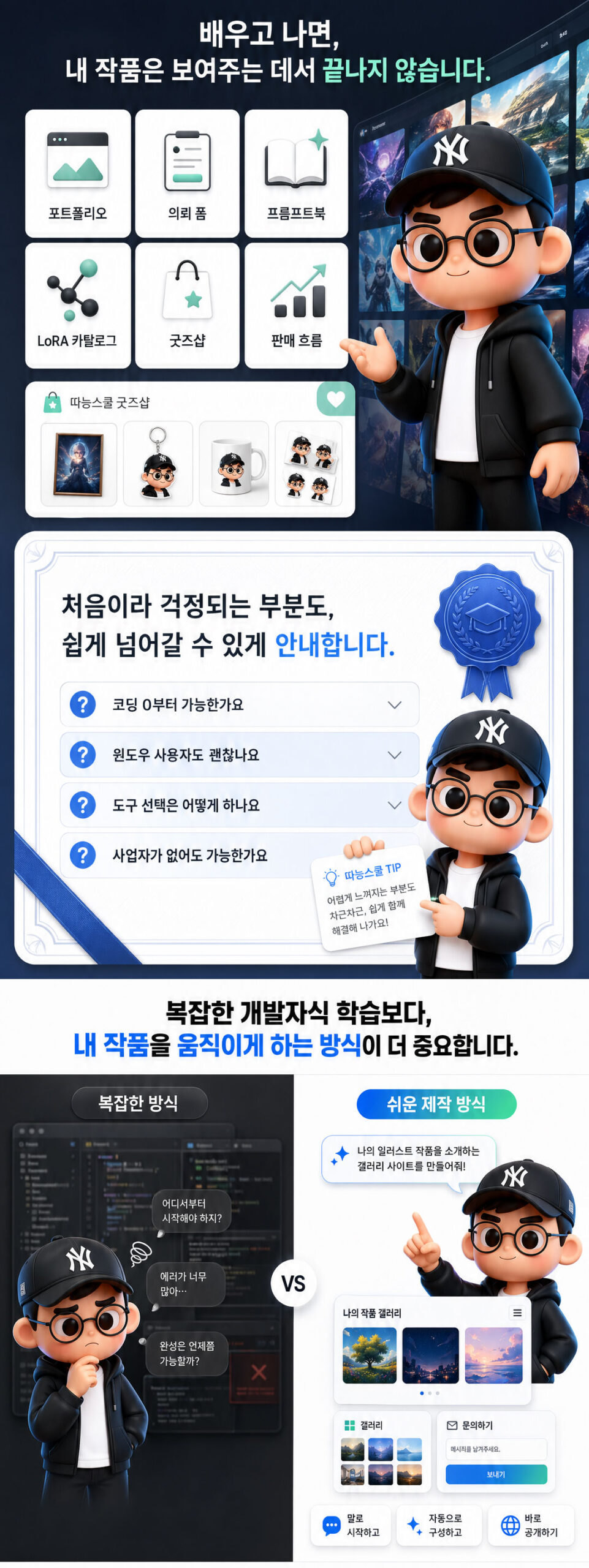 | 4회차 | 결제 · DB 연동과 실전 상담 • (a) 결제 모듈 붙이기가 생각보다 쉽다 — 토스페이먼츠 가상결제, 사업자 없어도 OK • (b) 실제 결제 모듈을 간단히 만들어 붙이는 법 시연 • (c) Supabase / Neon Cloud / Convex 무료 플랜 비교와 클라우드 DB 첫 경험 • (d) 사업자 / 비사업자 / 해외판매 / 굿즈 실물 — 수강생 상황별 졸업 분기 가이드 + 도메인 직접 연결 • 자유 상담 라운드 — 본인 사이트의 막힌 곳, 키우고 싶은 방향, 다음 한 달 로드맵 |